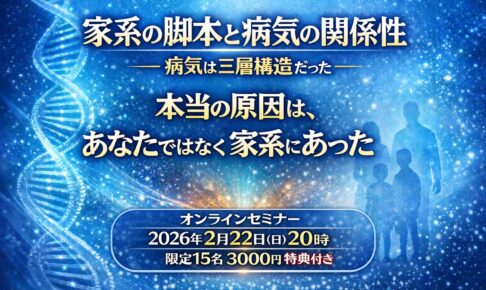 セミナーのお知らせ 【オンラインセミナー開催2/22特典付き】家系の脚本と病気の関係性~本当の原因はあなたではなく家系にあった~ 2026.01.30 鈴木たか どれだけ生活習慣を整えても、どれだけ感情に向き合っても、なぜか繰り返してしまう「病気」「症状」「生きづらさ」。 それは、本当にあなたのせいなのでしょうか。 病気や症状、 人間関係のトラブル、 子どもの問題、 お金の問題 …